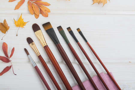 brushes for make up (drawing) decorate autumn leaves on white wood backgraund.
