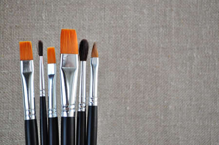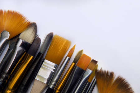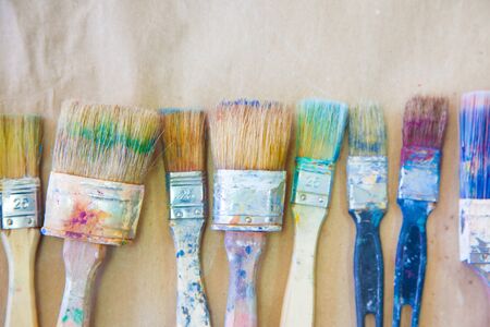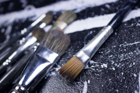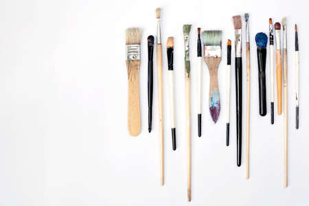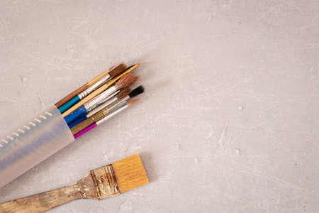 Set of random brushes for painting on light gray textured background. The concept of creativity, art. Copy space. Selective focus. Monochrome