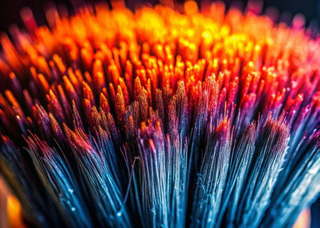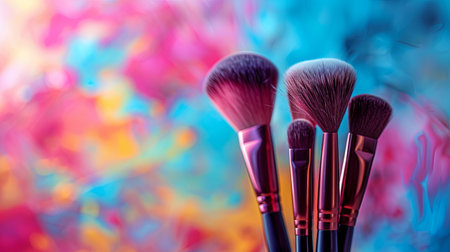 Close up view of multiple makeup brushes arranged together against a colorful background. Generative AI