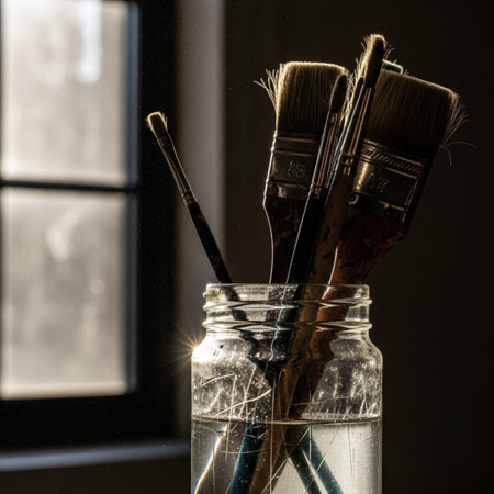 Used paintbrushes soaking in a jar of turpentine on a dusty workbench, side profile silhouette.
