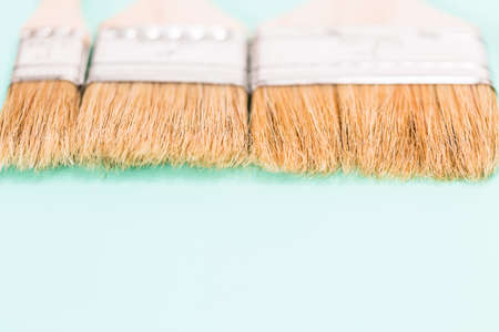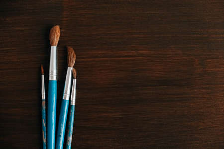 Drawing tools, set of clean paint brushes on gray background. Paint brushes of different sizes. Copy space, top view