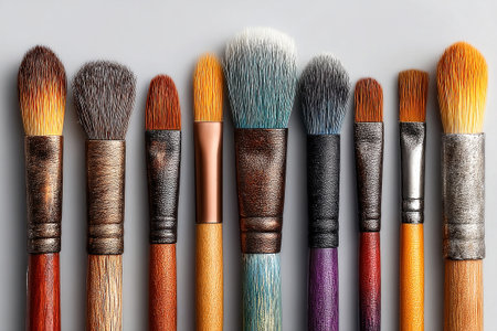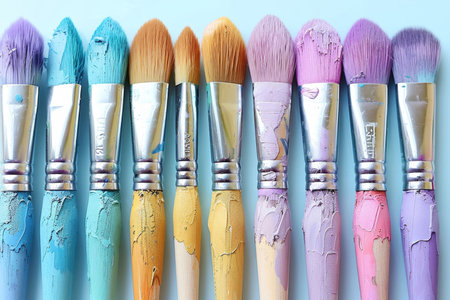 Various paintbrushes are arranged in a row showcasing vibrant colors on their bristles. Each brush displays a unique shade, revealing creativity and artistic expression.