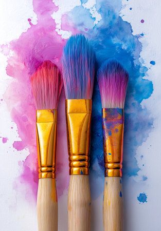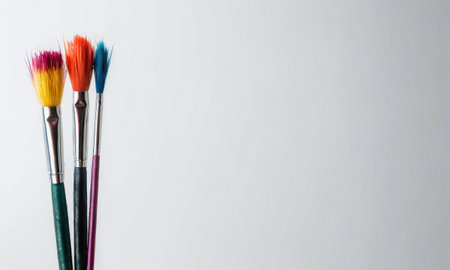 Three paintbrushes with brightly colored tips stand against a pristine white background, highlighting a contrast between the vibrancy of paint and the blank canvas. The image captures the potential of an artists primary tools before creation begins.