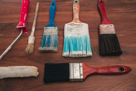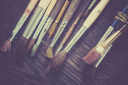 two brushes to paint on a wooden table. Photo and place for your text. Hard work abstraction.