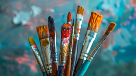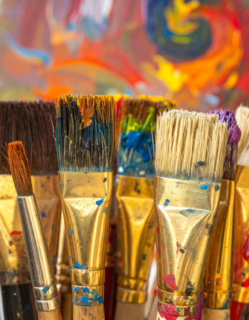 A collection of well-used artist's paintbrushes, their bristles still holding the vibrant colors of a recent creation, stand ready against a backdrop of an abstract, colorful canvas.