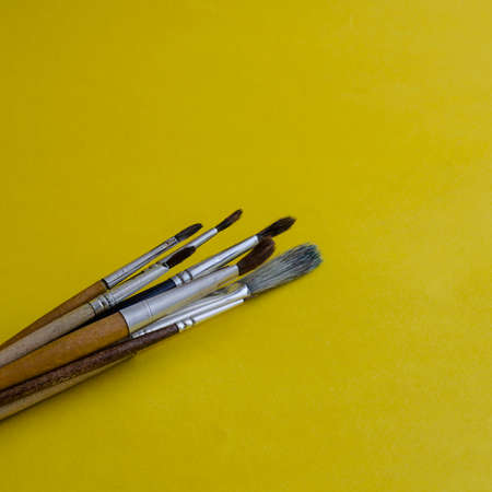 Five random brushes for painting on yellow background. The concept of creativity, art. Copy space. Selective focus.
