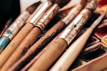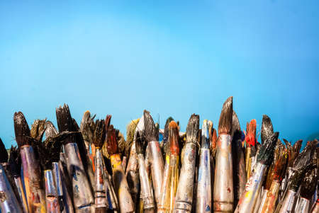 A lot dirty artist paint brushes in a bucket. Different artist brushes, close-up view