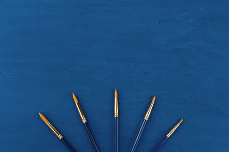 Various types of artistic paintbrushes on blue paper background. Copy space