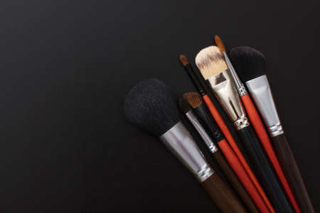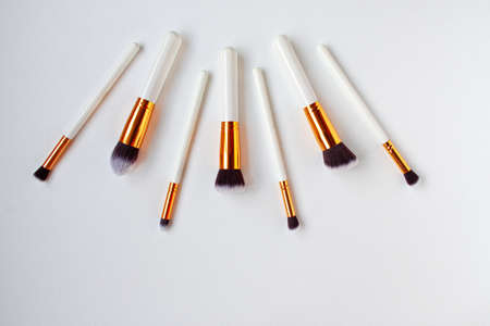 Flat lay top view of female cosmetics brushes set for makeup on white background. Cosmetics and beauty concept. Make up concept with space for text.