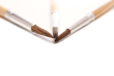 Clean art colored brushes with white, black and orange bristles close up lie on a white watercolor sheet diagonally. The workplace of the artist
