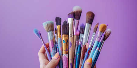 The image is of a handful of paintbrushes of various sizes, being held in a hand against a purple background.