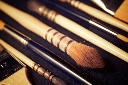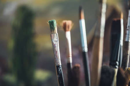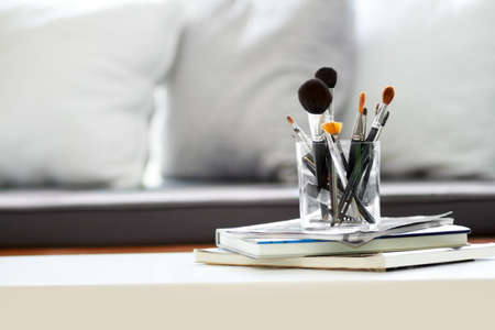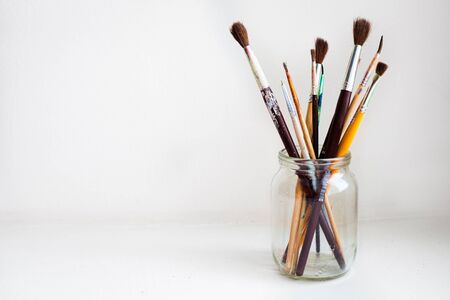 Artist's workplace. Different size and quality artistic brushes in ceramic jug.