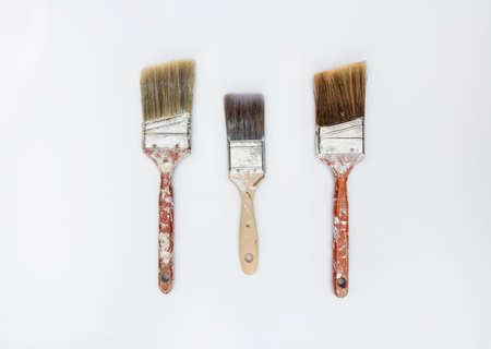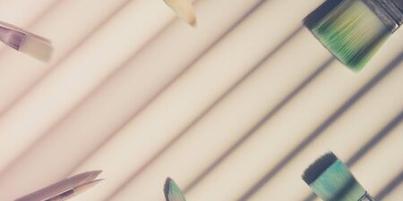 Paint brushes and rag on a white background. Banner. Flat lay, top view.
