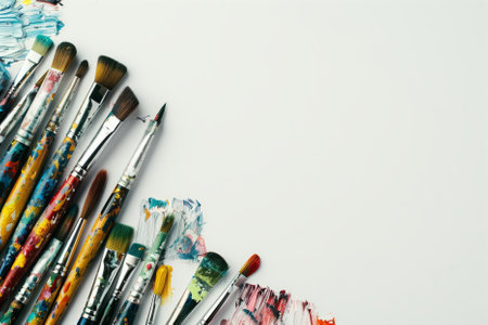 Flat lay with a used artistic tools and place for text on a white background. AI generative