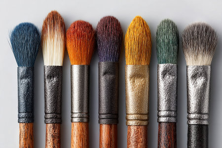 Colorful paintbrushes arranged in an artistic display showing vibrant colors and textures in a creative workspace setting