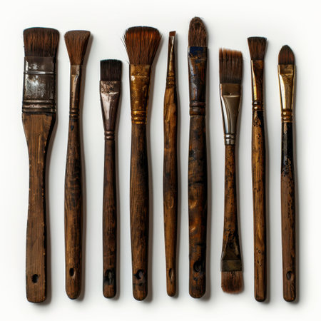 A collection of old, worn-out paint brushes displayed against a wooden background