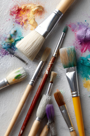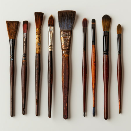 A collection of various sized paintbrushes lies on a flat surface, showing their unique shapes and worn bristles. The tools are essential for artists to express their creativity.
