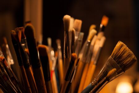 artist brushes in the stand on blurred background.