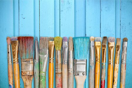 Old dried paint brushes on a wooden background