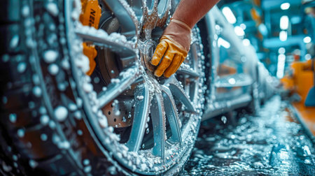 car wheel is washing in soap suds
