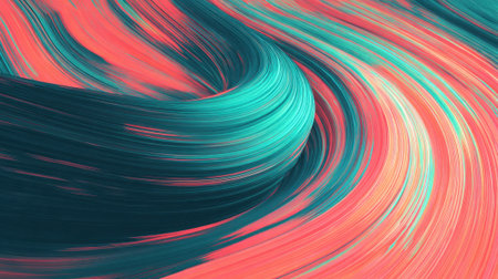 Bright colors intertwine in fluid patterns, showcasing a mix of turquoise and coral hues. The smooth strokes convey a sense of movement and artistic expression.