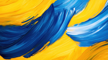 An abstract artwork showcases vibrant blue and yellow brush strokes, blending together to create a dynamic and eye-catching composition full of movement and energy.