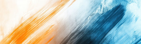 Abstract art with bold blue and orange acrylic paint brush strokes on white canvas, modern texture, vibrant color, contemporary minimal design trend.