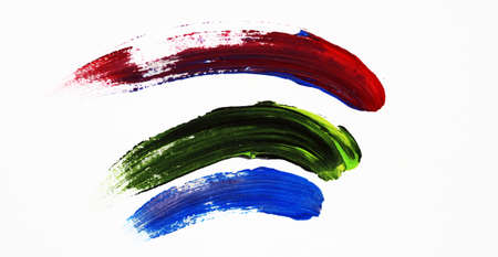 Colorful smears of paint on white free space. Abstract background of blue, red and black nail polish. Creative, art, design, beauty, decorative cosmetics concept