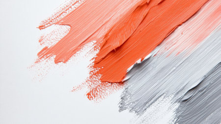 A clean white canvas features bold strokes of orange and gray, creating a vibrant artistic composition. This piece exemplifies creativity and an expressive style in a contemporary art space.