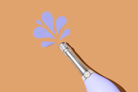 Very Peri champagne bottle on beige background with paper drops.