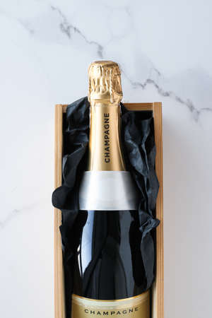 Wedding celebration, lifestyle and luxury present concept - A champagne bottle and a gift box on marble