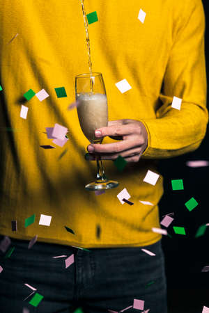 Young man in yellow sweater pour champagne in a glass