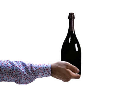 Alcohol drink. Advertising banner. Anniversary celebration. Holiday present. Unrecognizable gentleman holding brand mockup champagne bottle isolated on white empty space background.