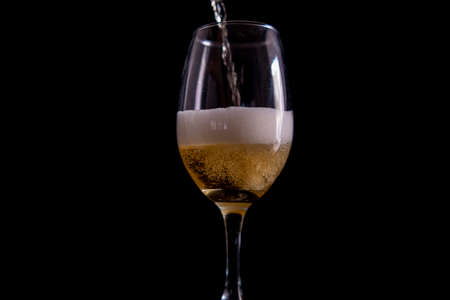 Pouring beer into a glass goblet with black background