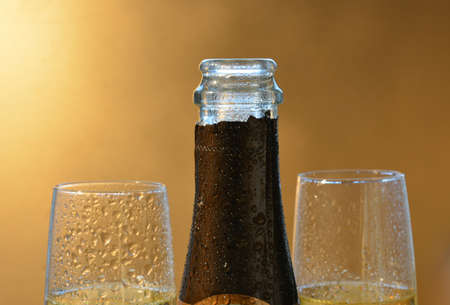 Champagne glasses on gold background. Party and holiday celebration concept