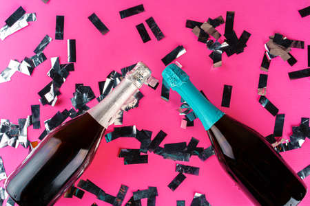 Champagne bottle with silver sparkles flat lay on pink paper background