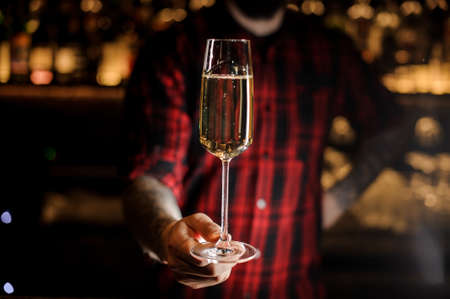 Professional bartender serving champagne in a glass