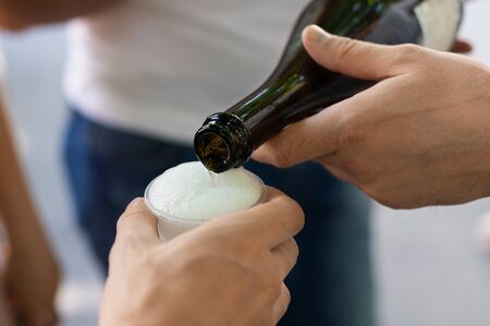at a celebration in the office, pours champagne into plastic disposable glasses. store opening. refreshments for guests
