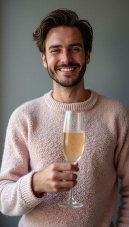 A smiling young man in a cozy pink sweater holds a glass of champagne, radiating joy and celebration. His warm smile and the elegant drink create an inviting atmosphere perfect for festive occasions.