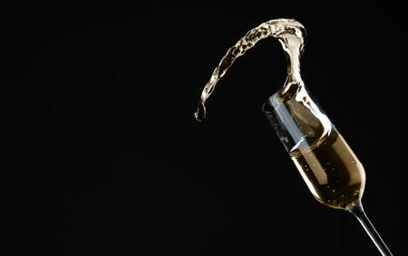 Sparkling wine splashing out of glass on black background