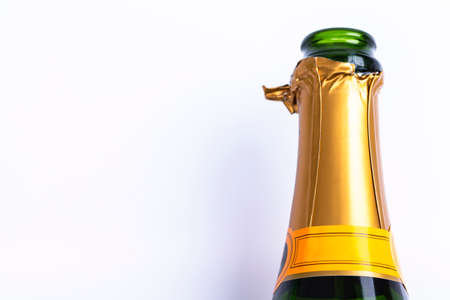 Top of shining Champagne bottle with rain drop on window background.