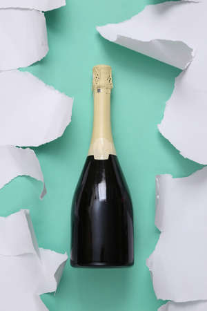 Champagne bottle on blue background with white torn paper. minimalism. top view