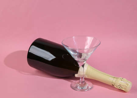 Champagne bottle and glass on pink background