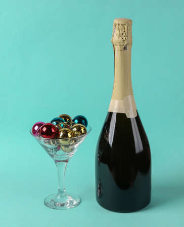 Cocktail glass with Christmas balls toys and bottle of champagne on blue mint background. Minimal christmas party concept