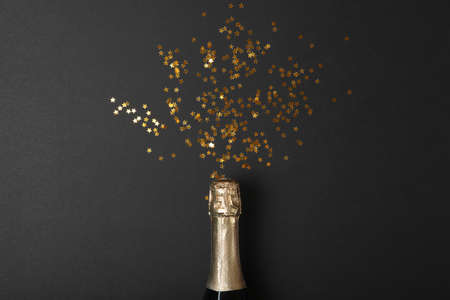 Celebration theme with champagne splashes on a black background with sequins and free space. Christmas or New Year, background.