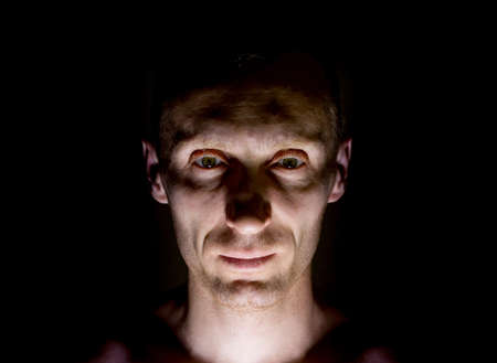 gloomy portrait of a guy in a white t-shirt with an evil face