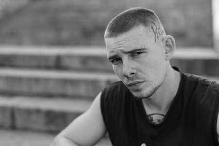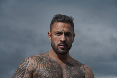 Portrait of a brutal man with tattoos on his arms and shoulders