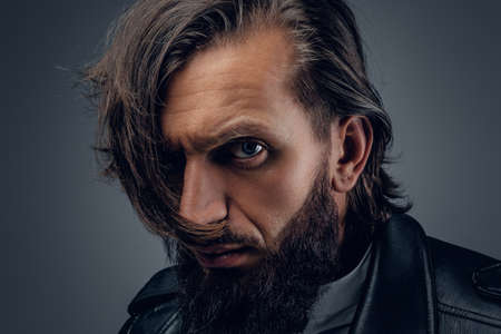Portrait of a handsome bearded man in a black leather jacket.