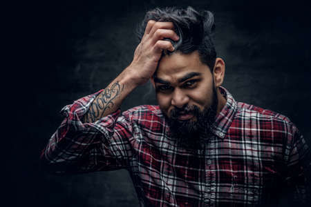 Attractive bearded Indian man in plaid fleece shirt over grey background.