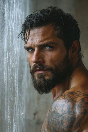 Close-up portrait of a brutal man with tattoos on his arms.
